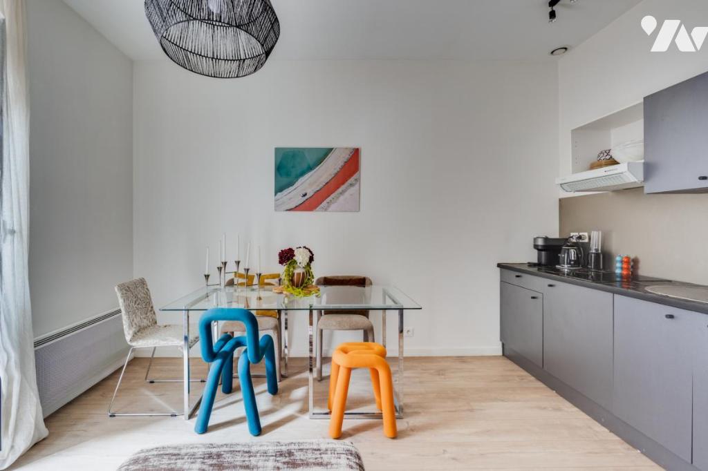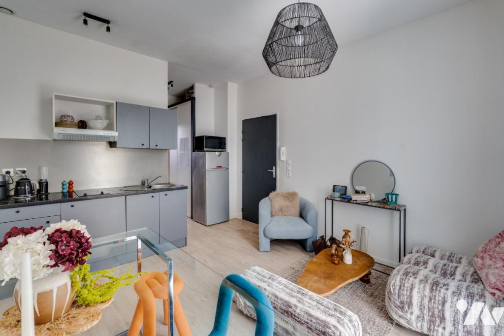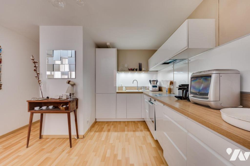 Vous profiterez d’un vaste séjour baigné de lumière grâce à une grande baie vitrée toute hauteur, avec une cuisine ouverte entièrement équipée et des électroménagers neufs.