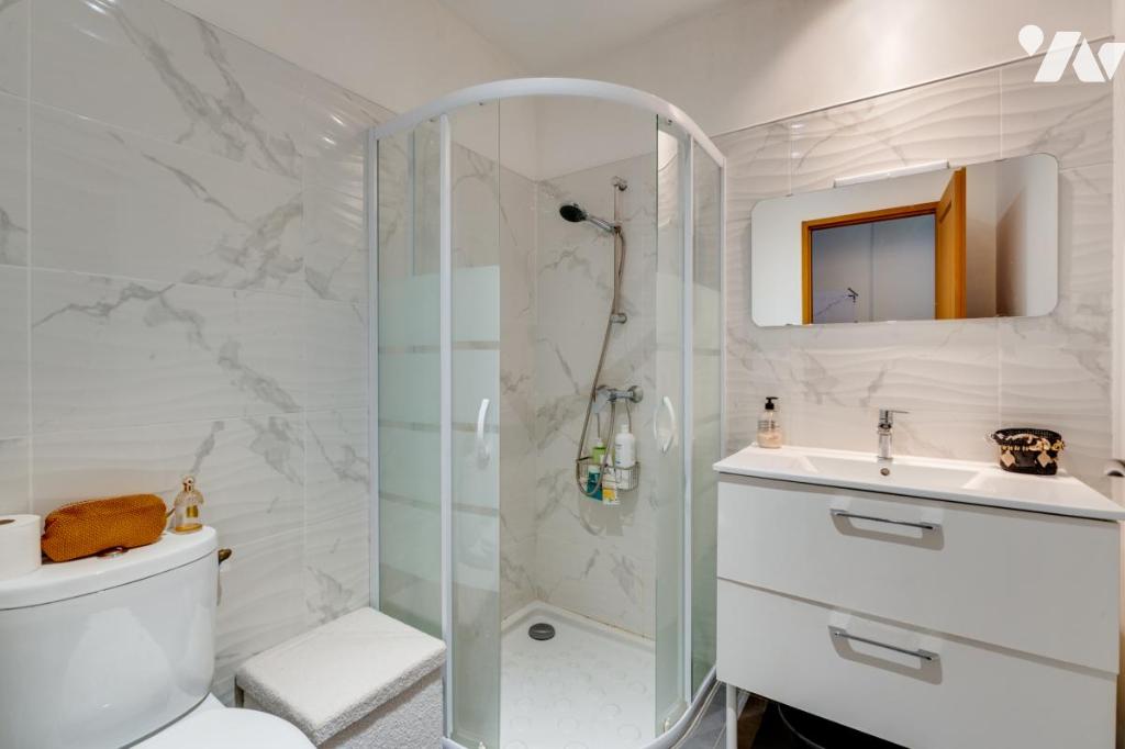L’appartement comprend également une salle d’eau moderne avec douche à l’italienne, des WC séparés, ainsi que deux chambres, dont l’une agrémentée d’une verrière et d’une porte d’atelier coulissante, ajoutant un charme unique à l’espace.