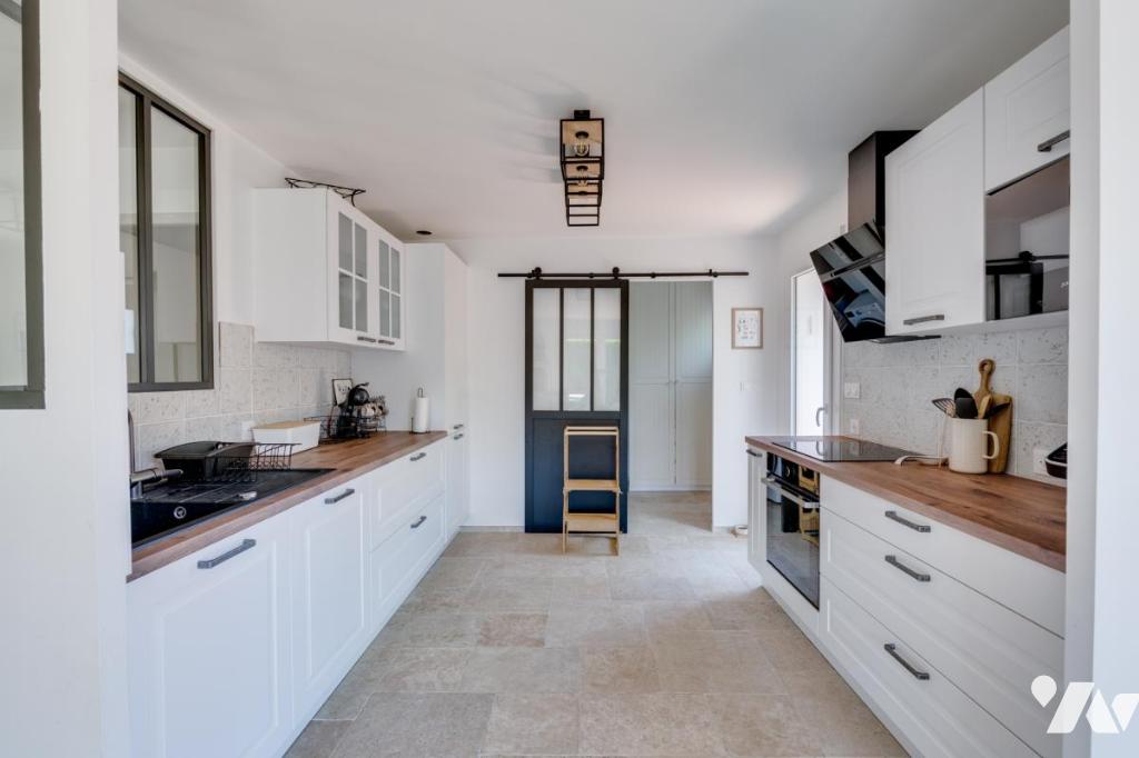 Maison familiale avec sa cuisine équipée ouverte sur le salon et l’espace de vie, ainsi que de nombreux rangements.