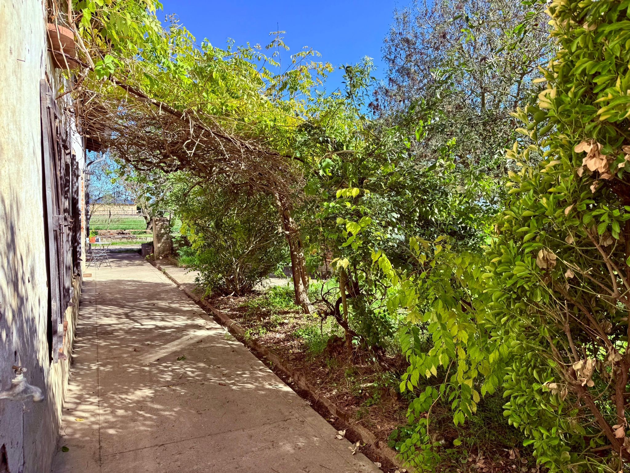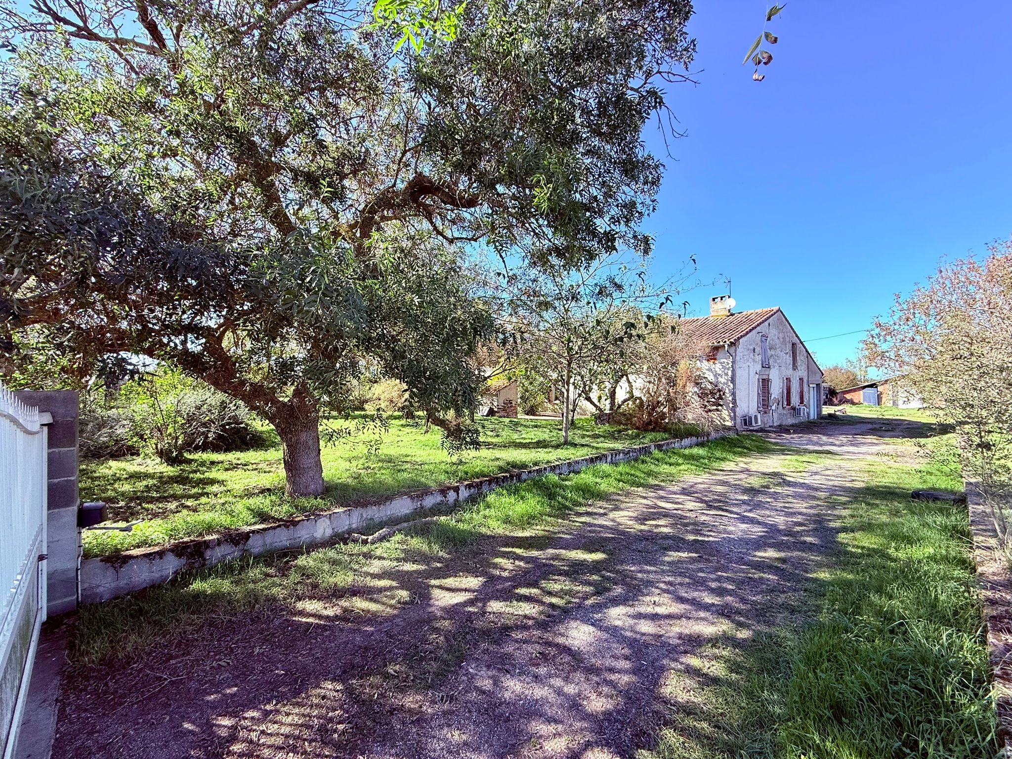 La propriété se dévoile par un petit chemin, une fois le portail franchi l’entrée donne sur un cour ombragé.