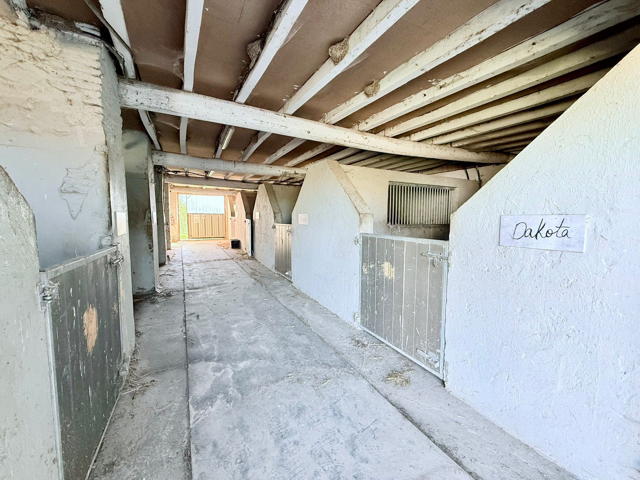 Un couloir atypique dessert la salle de bain ainsi qu’une salle de rangement dressing qui permet de passer directement dans la partie des écuries.
