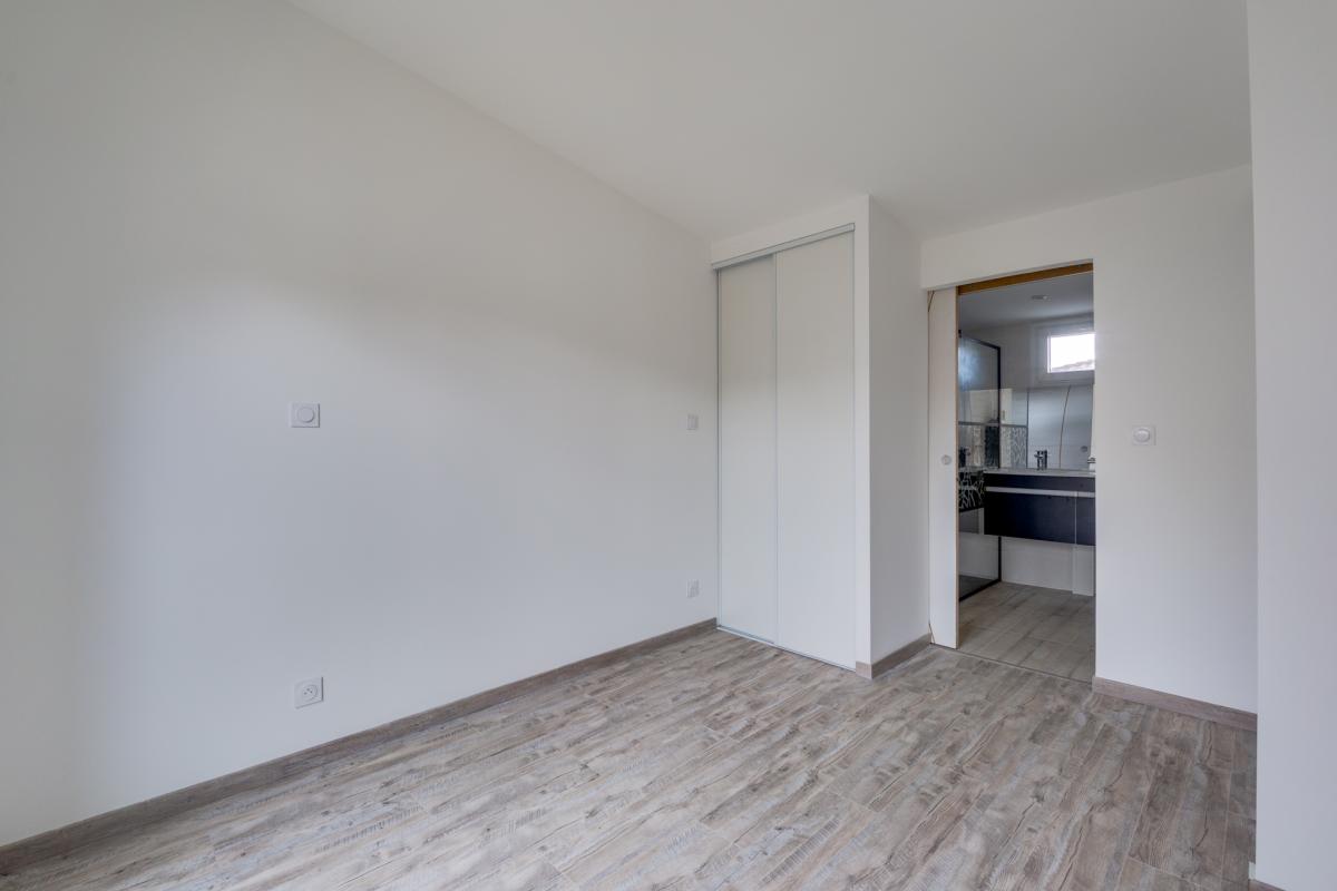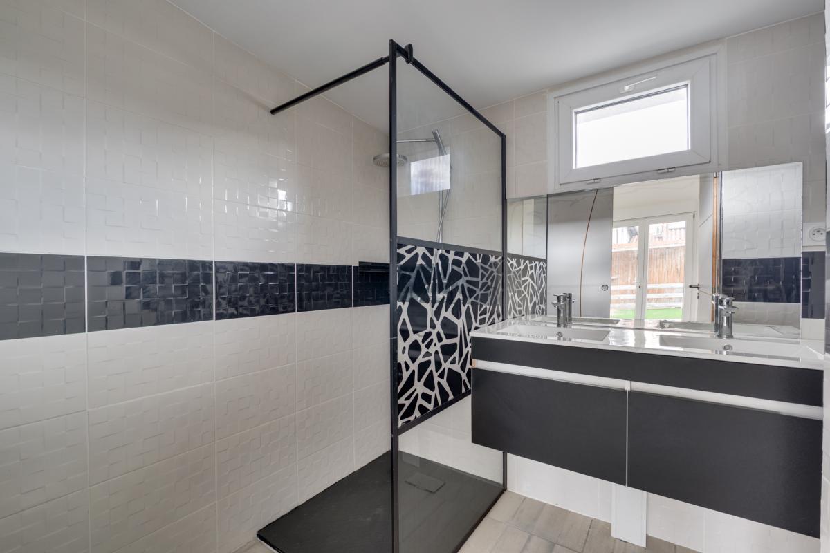 À l’étage, une élégante passerelle architecturale dessert l’espace nuit composé de trois chambres avec placards, d’une salle d’eau avec WC et d’une grande salle de bains, offrant un agencement idéal pour une vie de famille confortable.